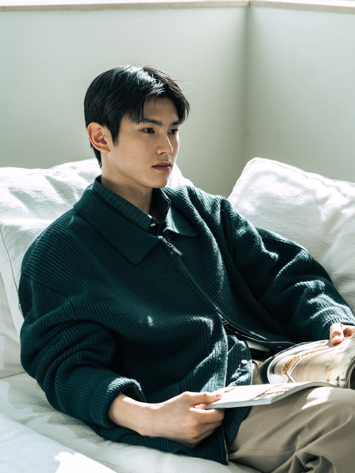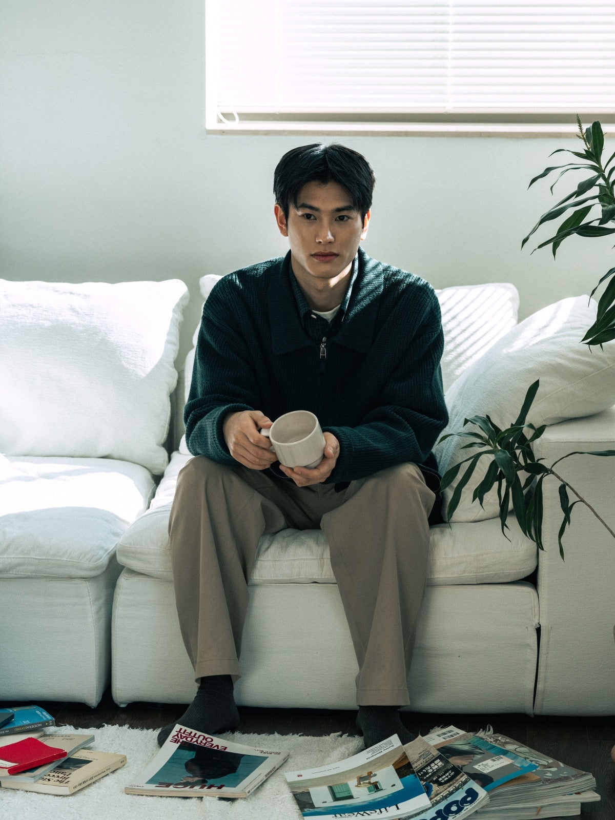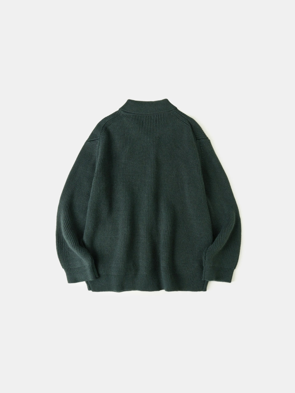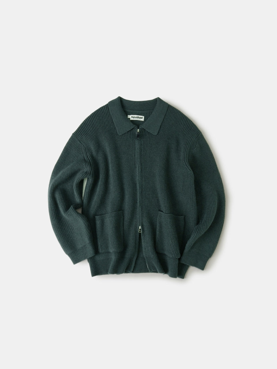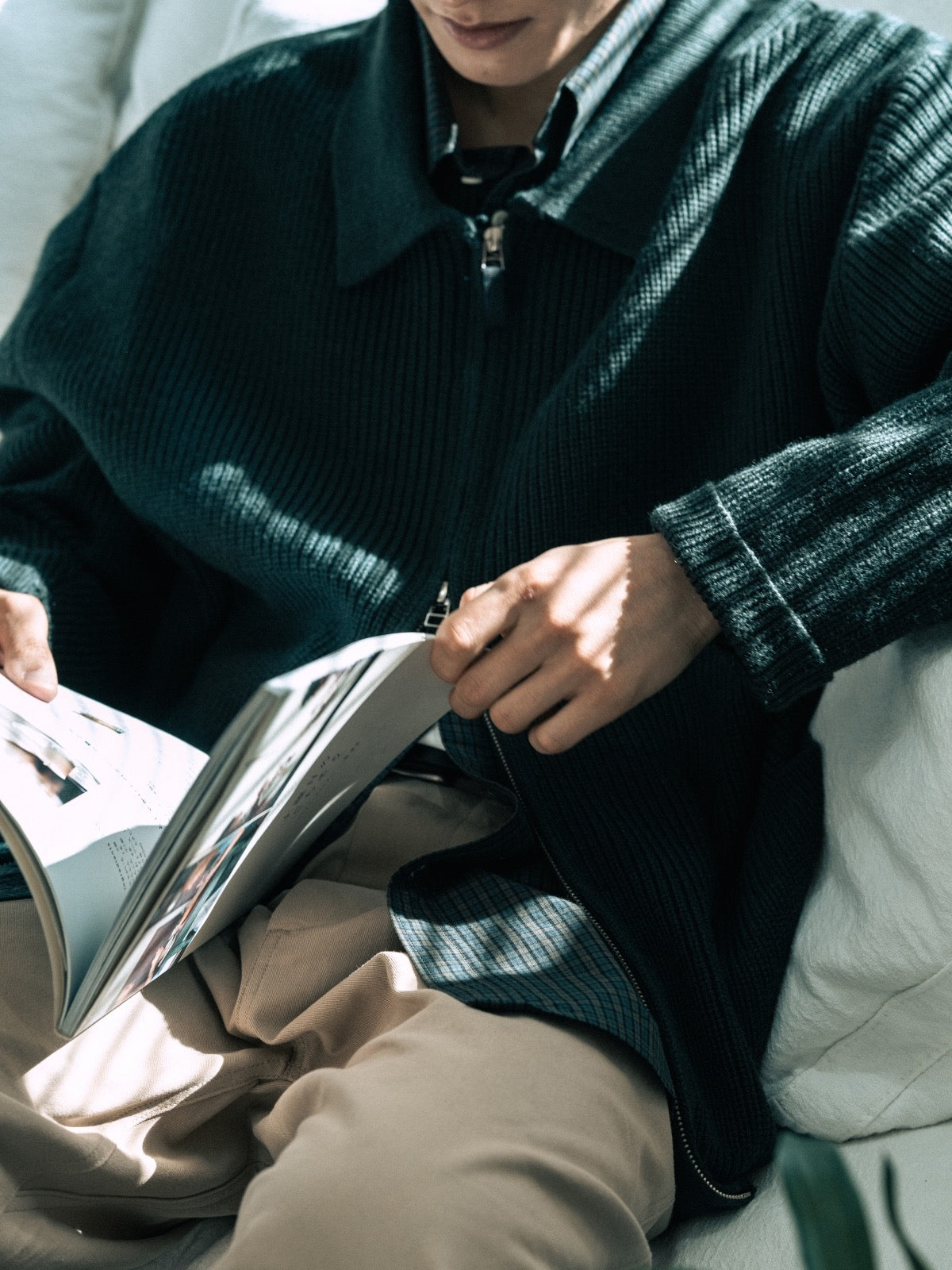 ほどよい重さとやわらかなウール混素材で、寒暖差のある季節の変わり目でも気軽に着用できます。立体感のある編み地とソフトな肌触りが魅力。バランスの取れた襟とゆとりのあるシルエットが合わさり、1枚での着用はもちろん、さまざまなレイヤードにも自然になじみます。2WAYジップ仕様で下側のファスナーを開ければAラインにアレンジでき、レイヤードのスタイリングにも柔軟に対応。ウールならではの弾力としっかりしたローゲージ編みで、耐久性と実用性も備えています。季節の境目に、つい手に取りたくなる一着です。