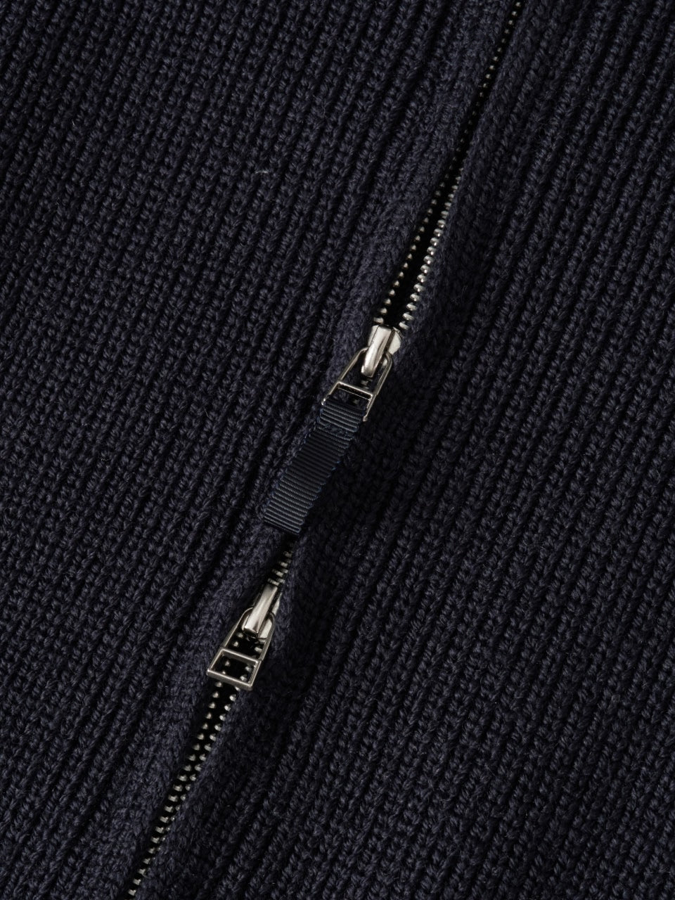 ほどよい重さとやわらかなウール混素材で、寒暖差のある季節の変わり目でも気軽に着用できます。立体感のある編み地とソフトな肌触りが魅力。バランスの取れた襟とゆとりのあるシルエットが合わさり、1枚での着用はもちろん、さまざまなレイヤードにも自然になじみます。2WAYジップ仕様で下側のファスナーを開ければAラインにアレンジでき、レイヤードのスタイリングにも柔軟に対応。ウールならではの弾力としっかりしたローゲージ編みで、耐久性と実用性も備えています。季節の境目に、つい手に取りたくなる一着です。