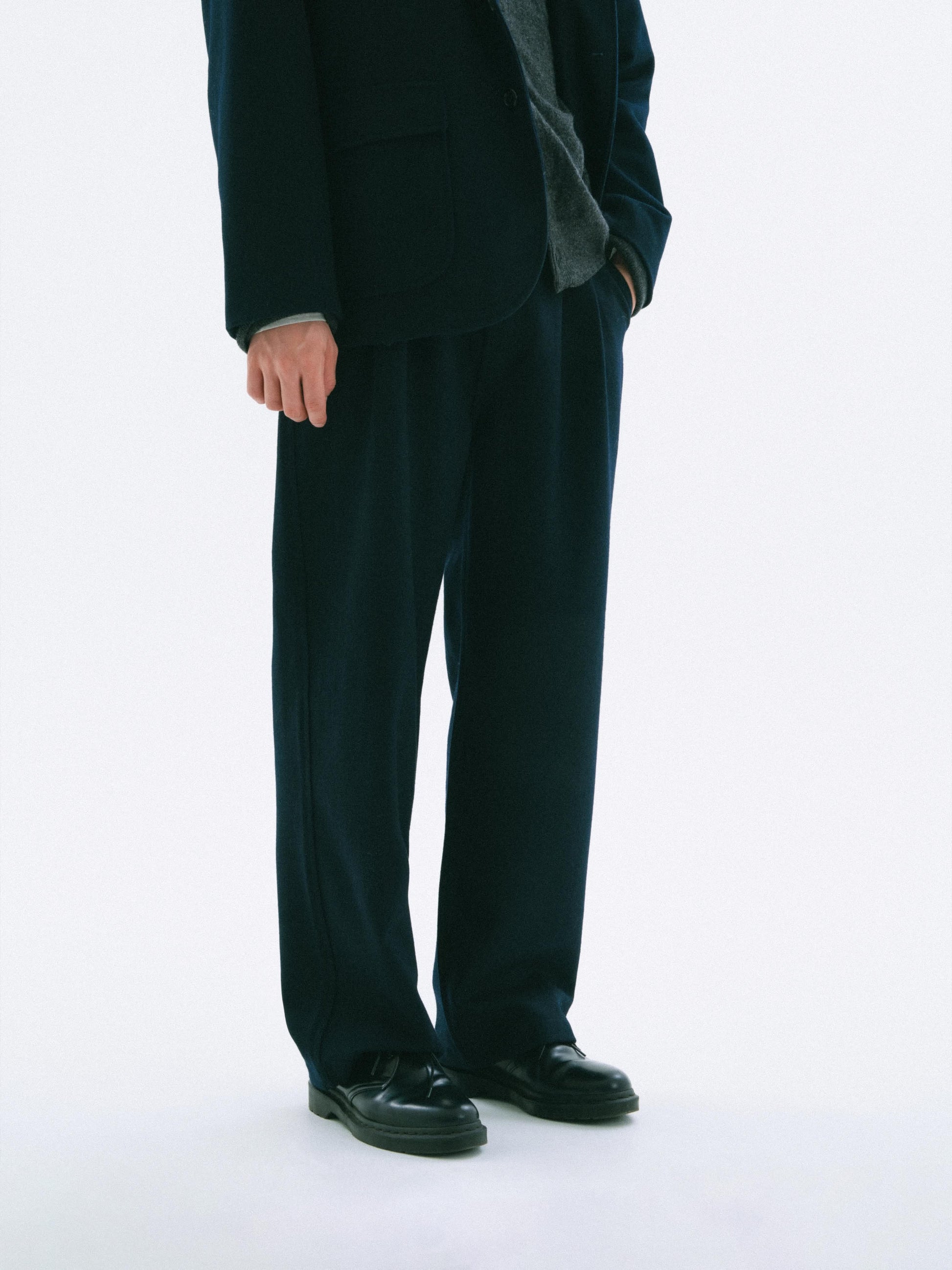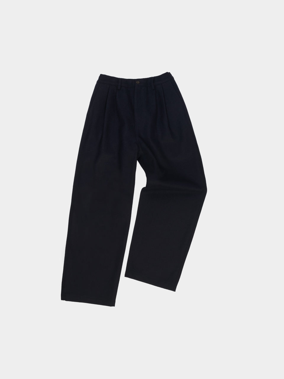 バランスの取れたシルエットと安定した着用感を持つピンタックトラウザーです。セミワイドフィットで体型を問わずに着こなせ、2タックのディテールがもたらす余裕のあるラインがきちんとしながら自然な印象を残します。ウールブレンド生地の柔らかい質感と優れた耐久性で、長時間着用しても形を保ち、さまざまなトップスと組み合わせて日常やビジネスに最適なアイテムです。