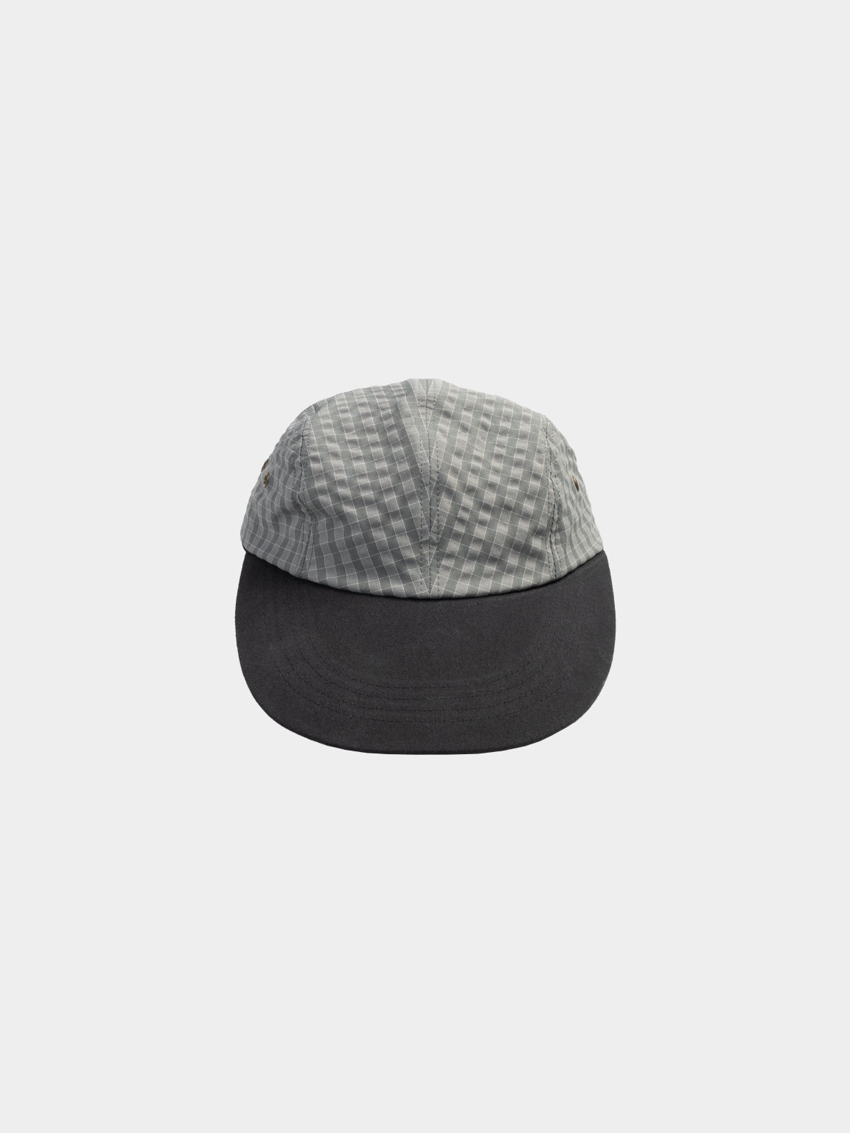 クラウンはナイロンチェック生地、ツバはコットン素材で、異なる質感が自然に対比されています。長く伸びたツバがすっきりとしたラインでクラシックな雰囲気をプラスし、控えめに表現されたチェックパターンはさまざまなスタイルに無理なく合わせられます。後ろはコットンストラップとスナップボタンで仕上げ、簡単にサイズを調整できるので、誰でも快適に着用できます。