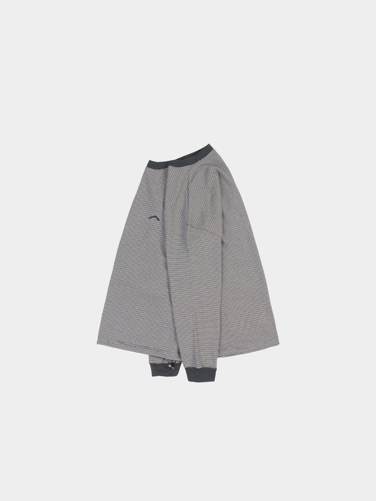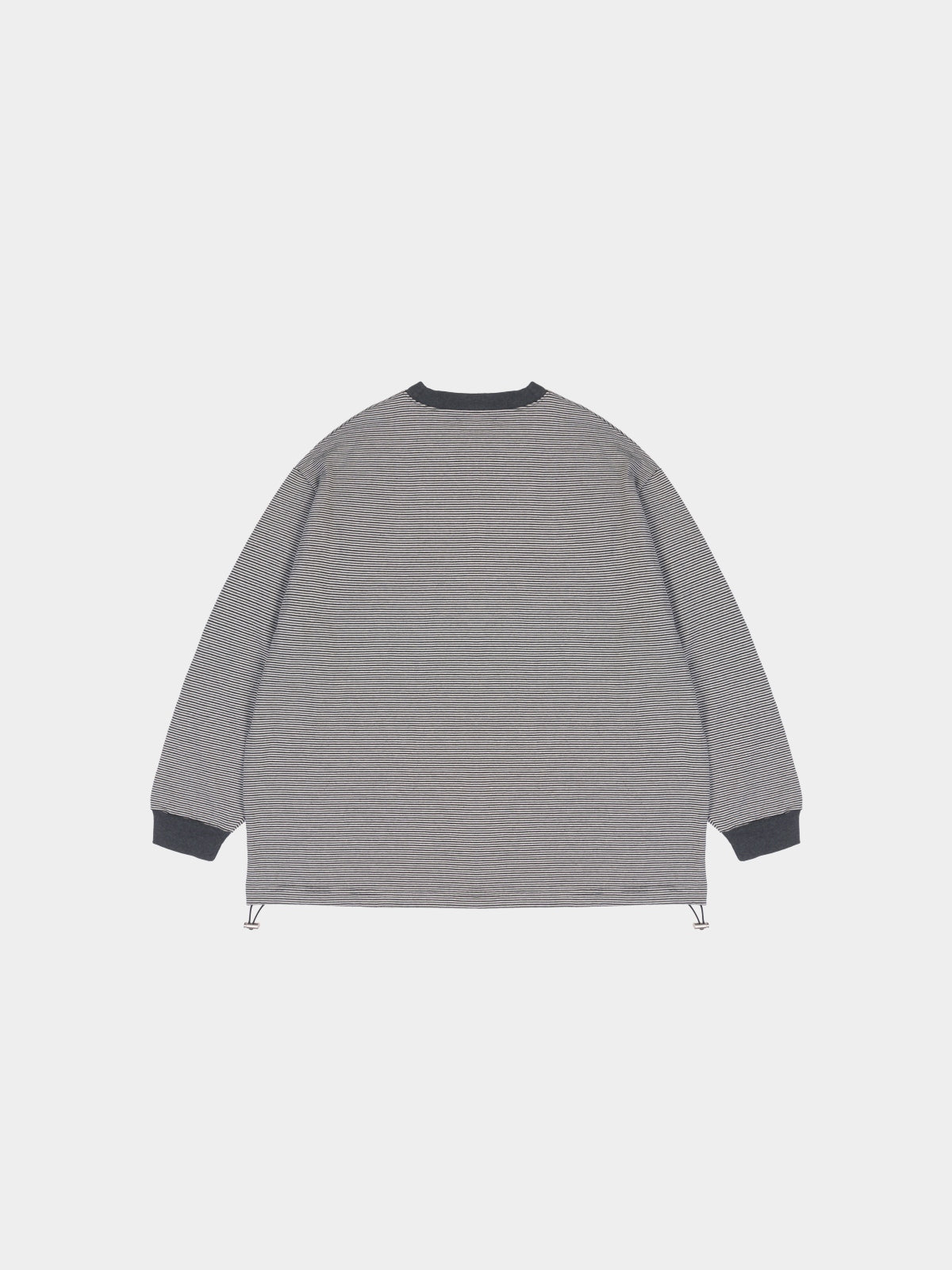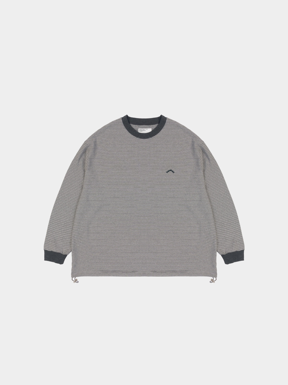ストリングディテールでボリューム調節が可能なロングスリーブTシャツです。2色が交差するストライプパターンがシンプルなベーシックTに個性をプラスし、裾のストリングを締めて立体的なシルエットを作るか、自然に解いてリラックスした着用もできます。同じトーンのリブ配色と小さなロゴ刺繍が全体をしっかりまとめています。季節の変わり目から年間通して活躍する実用的な構成が特徴です。