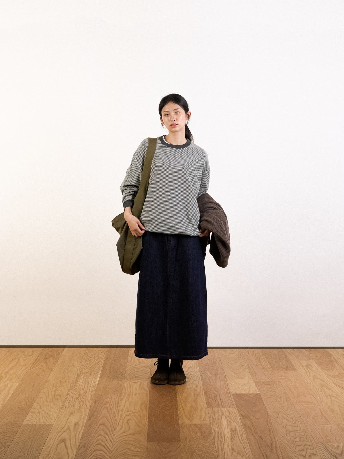 ストライプカラーの一色をリブに反映し、ネックラインと袖口の仕上げが安定感を持ち調和します。