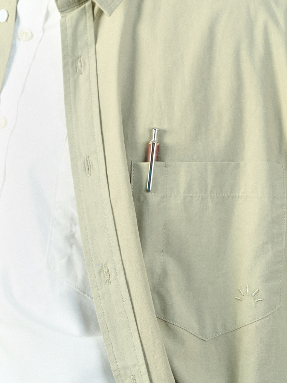 シンプルなロゴ刺繍が施されたペンポケットがポイントのスタンダードシャツ。都市での日常にぴったりのデイリーアイテムです。