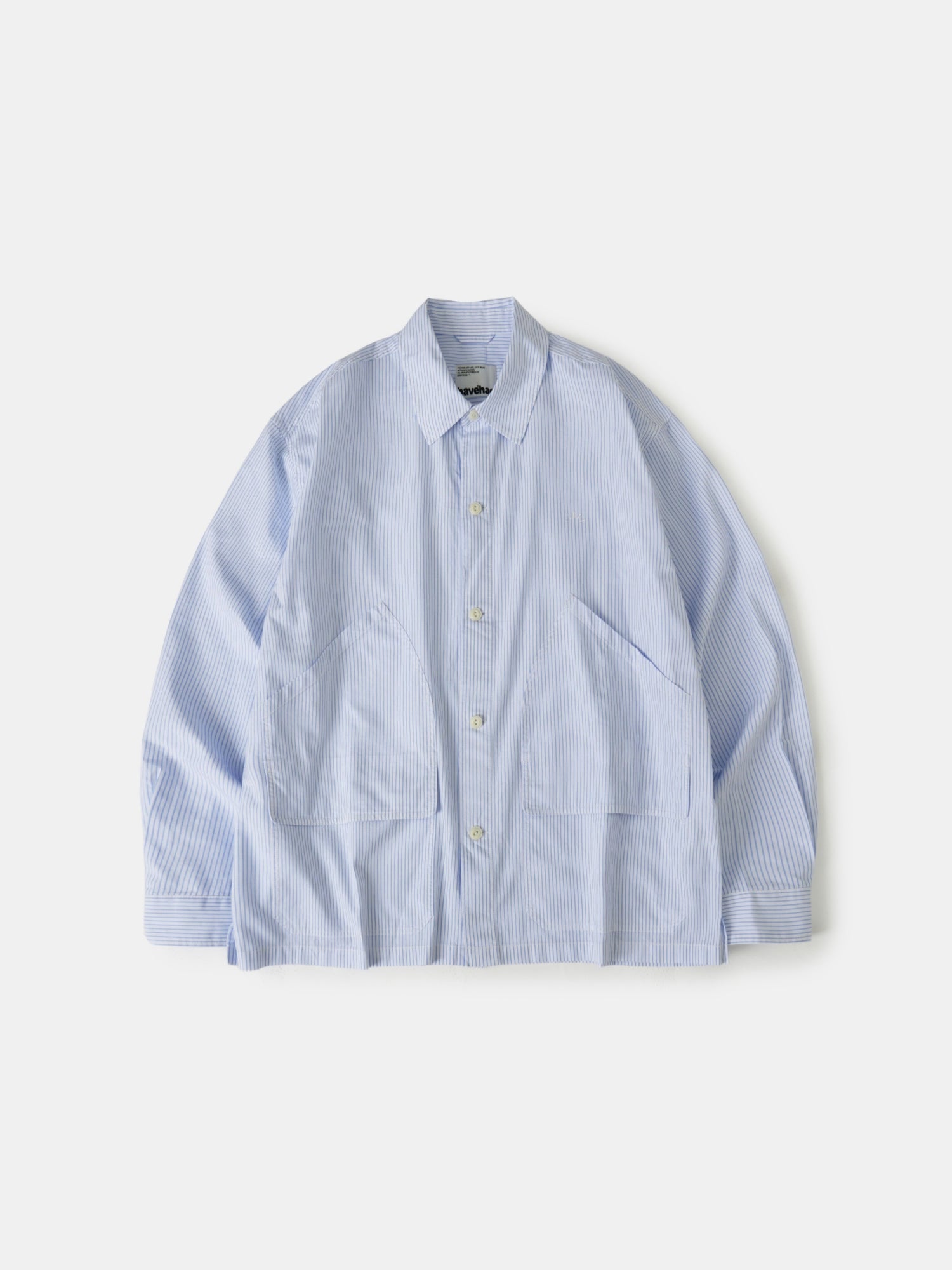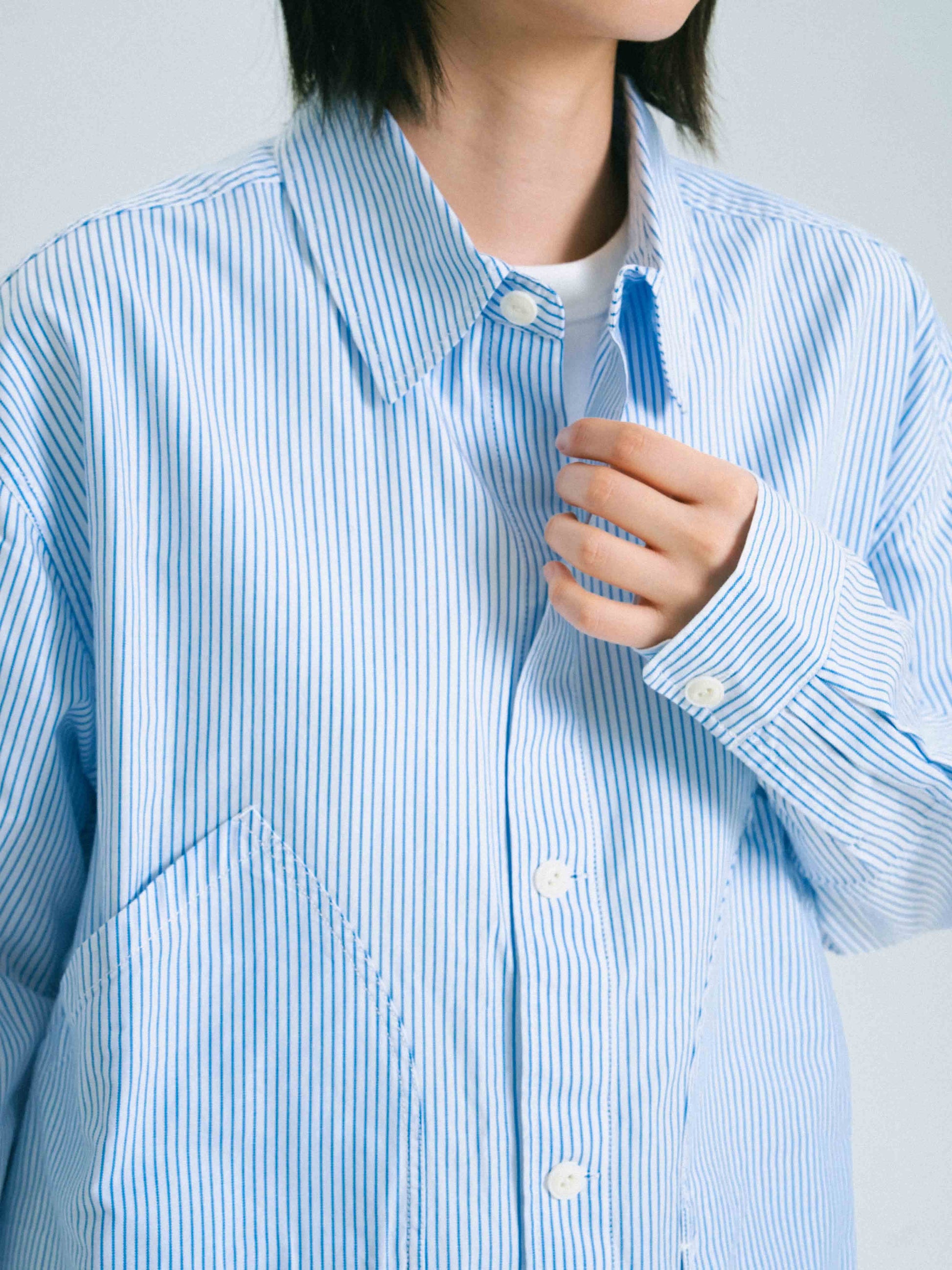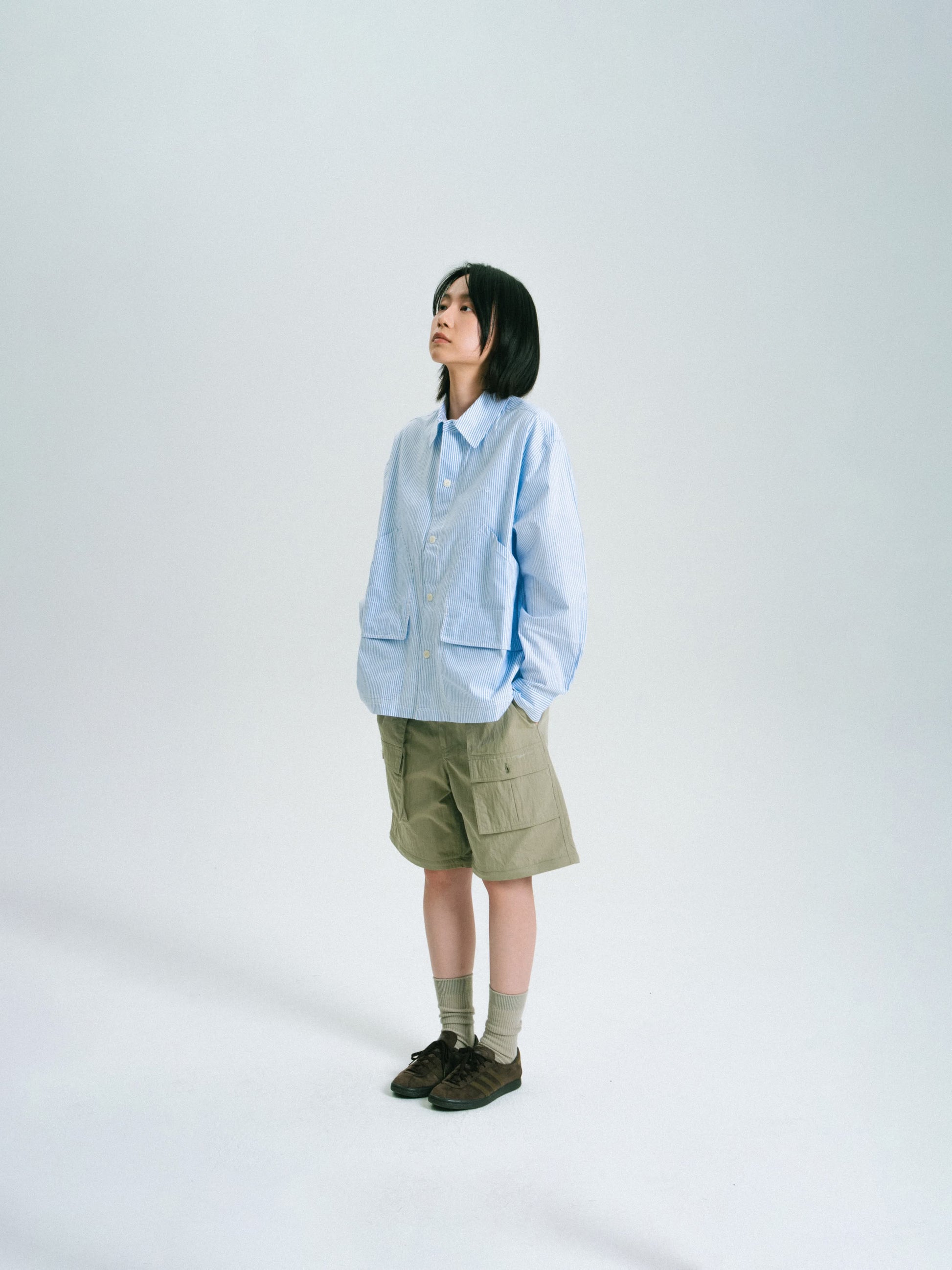 軽やかな40番手コットン生地を使用し、やわらかな風合いと軽い着心地に仕上げました。間隔の広い細ストライプがさりげないアクセントに。フィールドジャケット由来の斜めポケットとフラップポケットを左右に配置し、アウターらしい表情も演出します。肩はやや落ちたラインで、ゆとりのある身幅と少し短めの着丈。Tシャツやシャツのレイヤードにも最適です。トーンオントーンの刺繍ロゴが小さく効いて、全体を引き締めます。