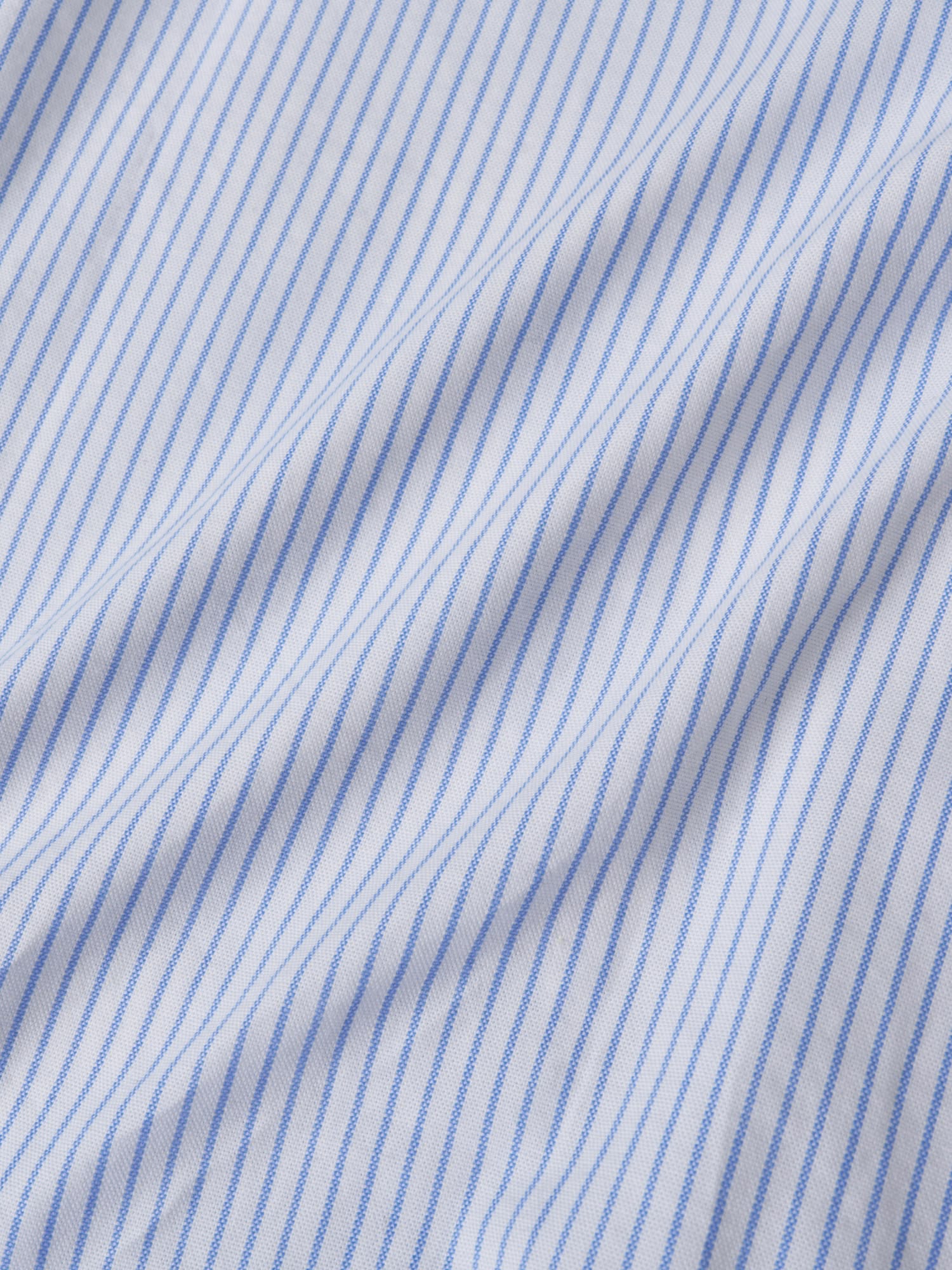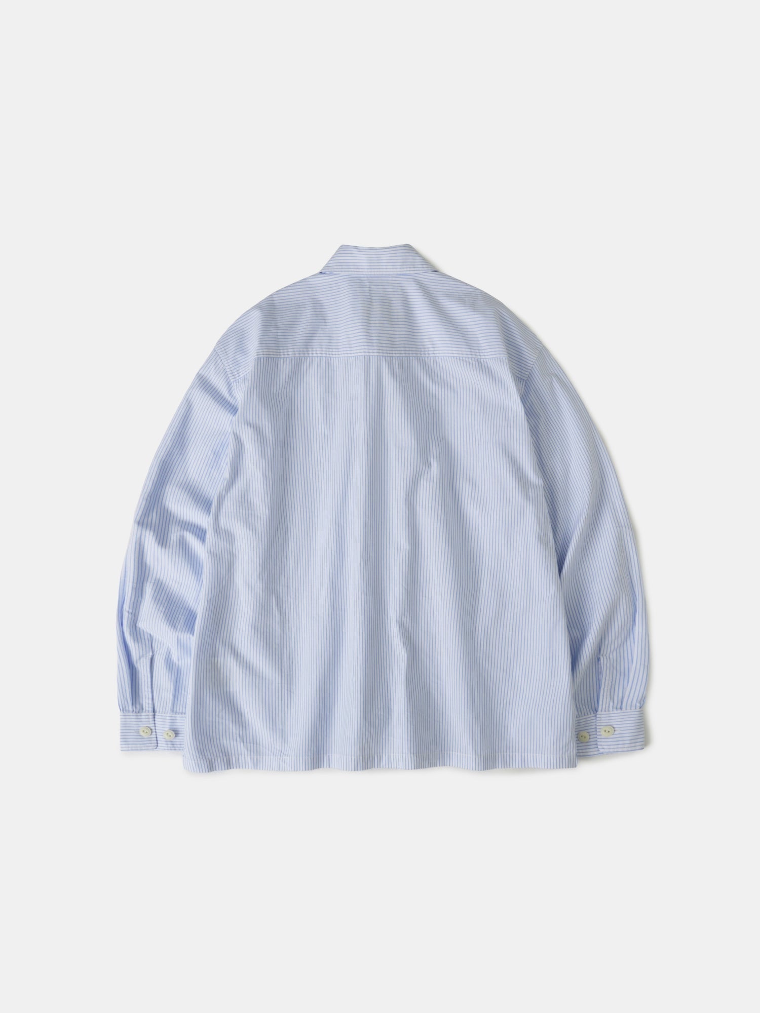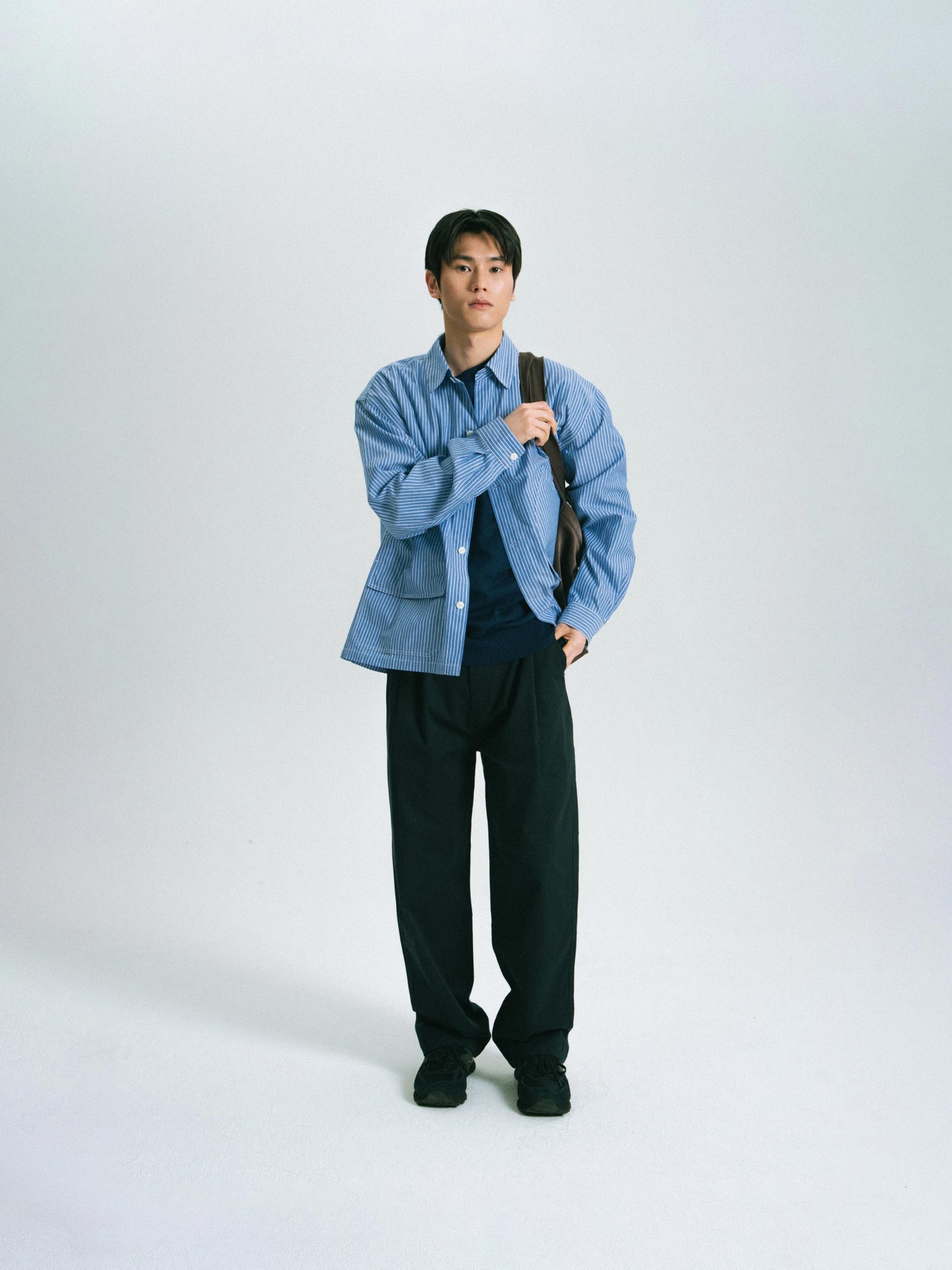 軽やかな40番手コットン生地を使用し、やわらかな風合いと軽い着心地に仕上げました。間隔の広い細ストライプがさりげないアクセントに。フィールドジャケット由来の斜めポケットとフラップポケットを左右に配置し、アウターらしい表情も演出します。肩はやや落ちたラインで、ゆとりのある身幅と少し短めの着丈。Tシャツやシャツのレイヤードにも最適です。トーンオントーンの刺繍ロゴが小さく効いて、全体を引き締めます。