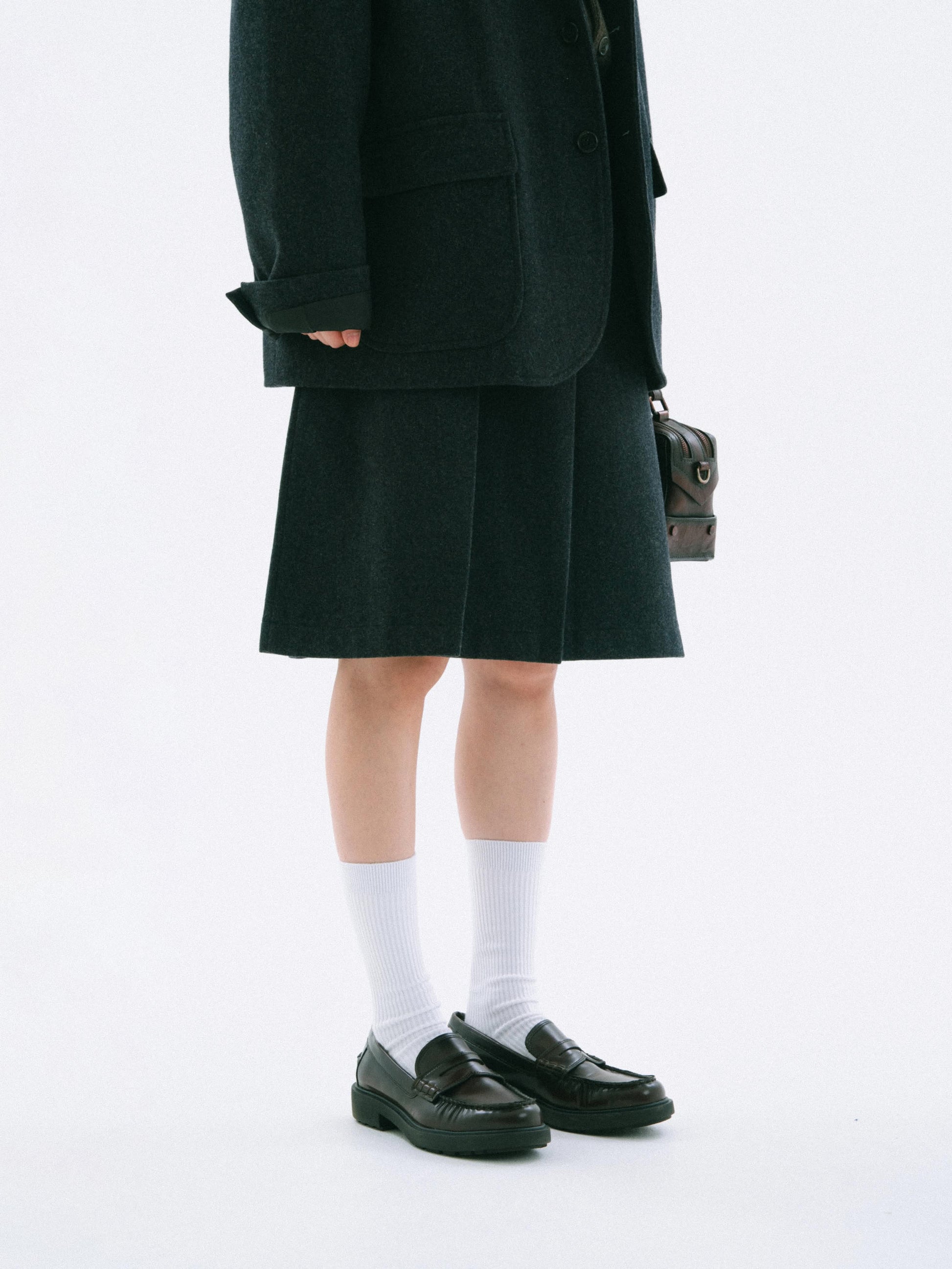 規則的なプリーツが作り出すラインが落ち着いた印象を与え、膝を少し覆う長さが様々な冬用アウターとバランスよくマッチします。