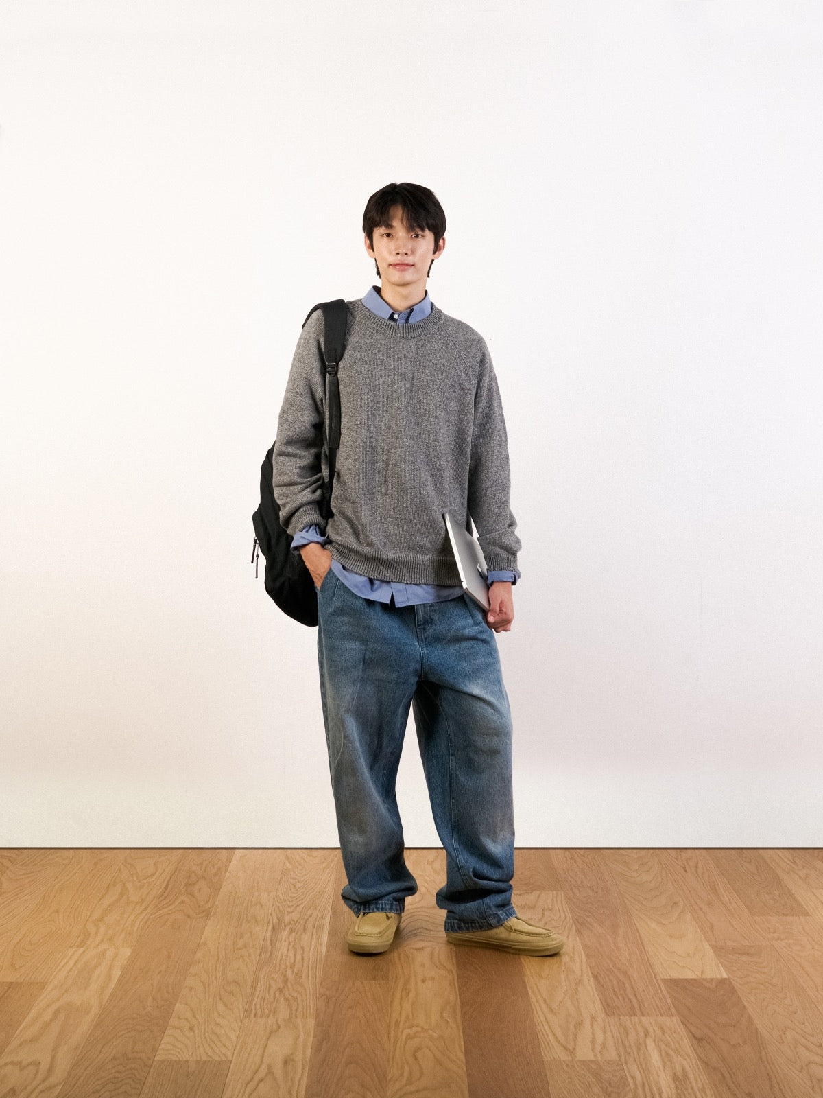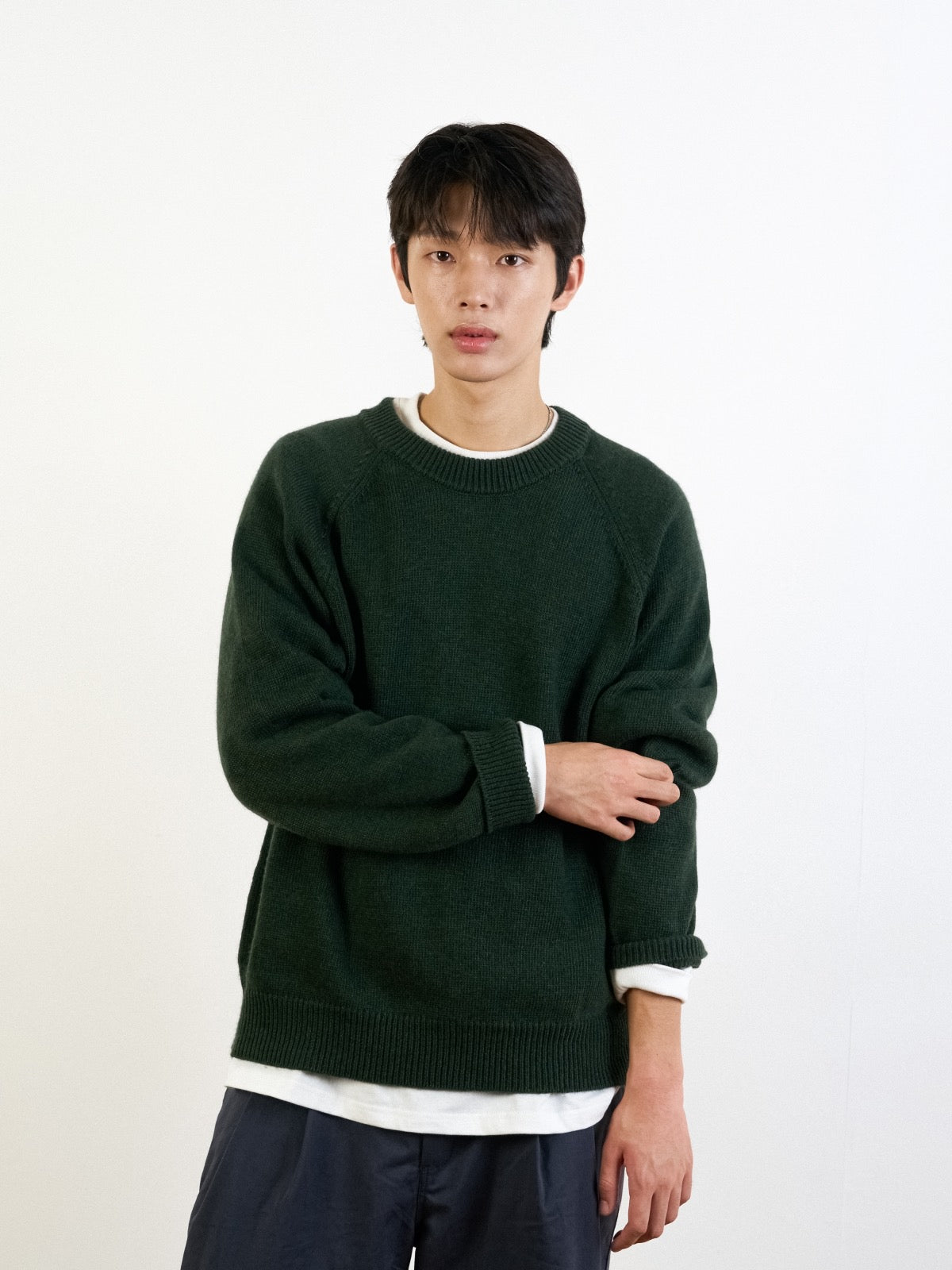 ヤクとウールを適切に混合して仕上げたクルーネックニットです。基本的な形ながらも、耐久性のあるネックライン、ゆとりあるフィット、自然に落ちるラグランショルダーラインで差別化された魅力を持っています。素肌に触れても柔らかく、保温性が高いため、季節を問わず着用でき、1枚でもシャツやTシャツとレイヤードしても自然にマッチします。